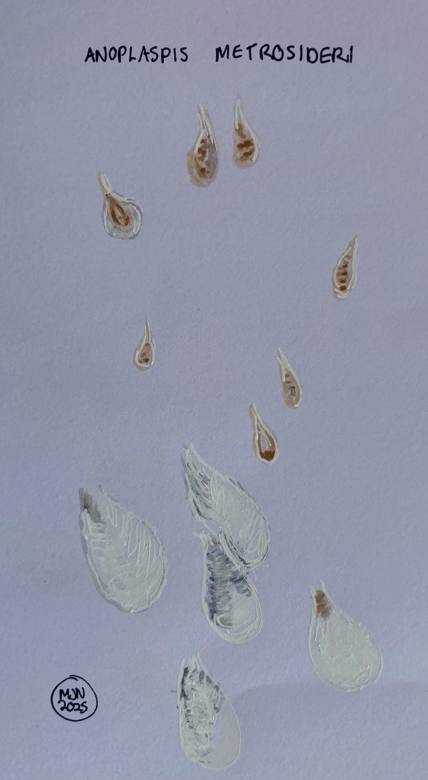 The next insect lives on pōhutukawa as well as related species such as southern rātā. Again, it doesn’t seem to have a common name, but it’s a kind of scale insect. These are insects which move around when they are newly hatched, but then they poke their straw-like tongues into a nice spot on a leaf and make that their home. Mostly they just look like blobs, because they cover themselves in a waxy coating for protection and it’s very hard to see the actual insect.